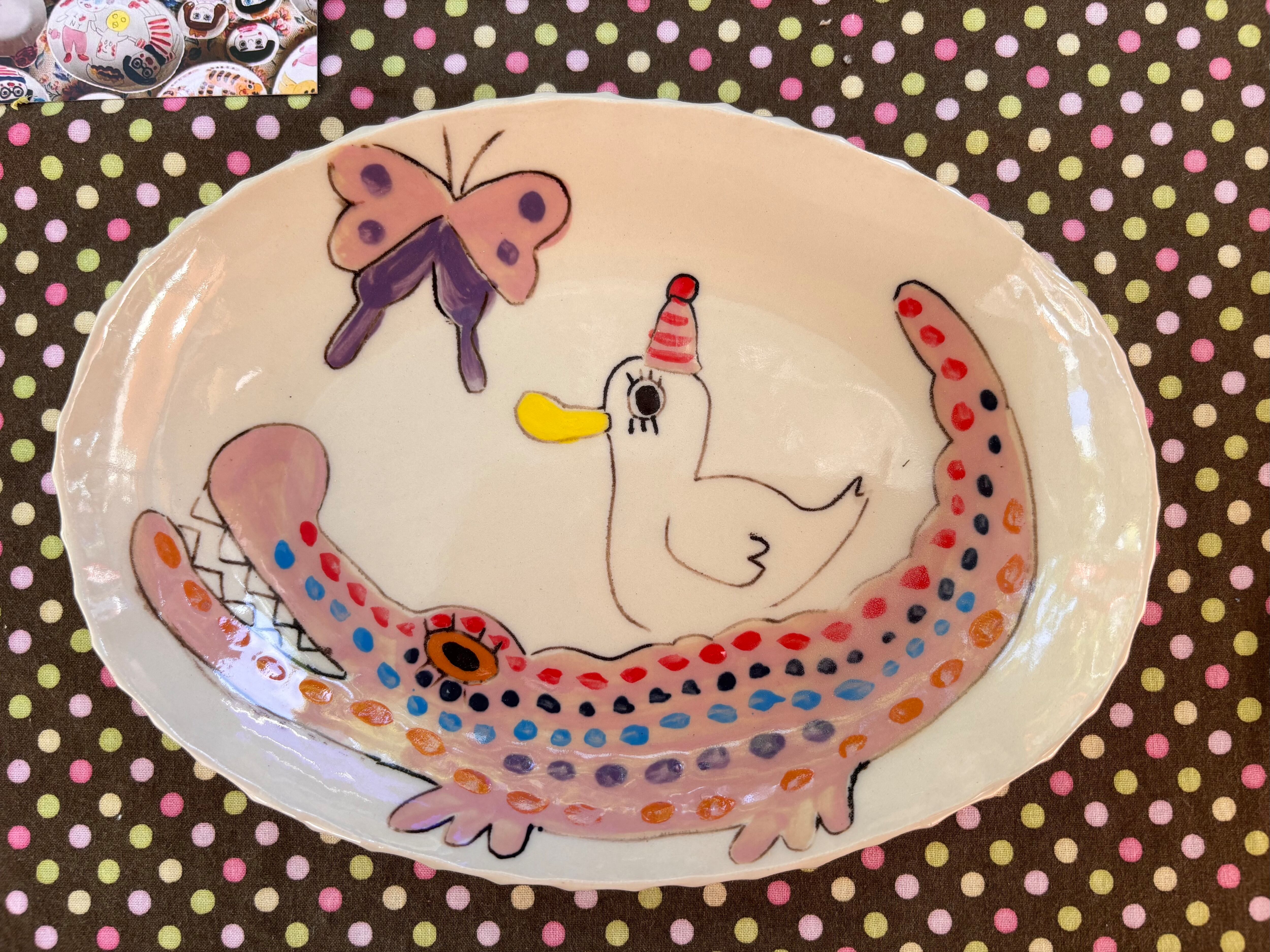 オーバル皿 ピンクのワニ